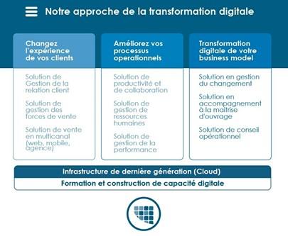 La transformation numérique vise tous les aspects de l’organisation, notamment le modèle d’affaires, le leadership et le management, la culture et l’organisation, les données, le marketing et l’expérience client, la stratégie de gestion du capital humain, le modèle opérationnel, la technologie ainsi que les compétences et les talents, afin de créer une entreprise intégrant le numérique et capable de mettre au point des façons novatrices d’exploiter, de changer et d’accroître ses activités. Si elle est réalisée dans le cadre d’une stratégie globale plutôt que de projets ponctuels, la transformation numérique peut vous aider à améliorer votre compétitivité au sein du monde numérique.