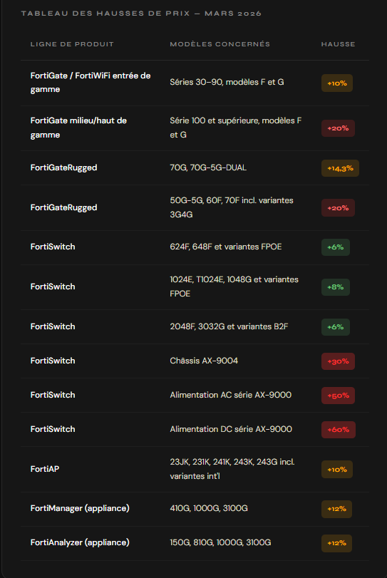 Cette hausse tarifaire bien que significative sur certains segments comme les alimentations FortiSwitch AX-9000 (jusqu'à +60%),s'inscrit dans un mouvement global affectant tous les équipementiers en cybersécurité. Fortinet maintient néanmoins son positionnement prix/performance parmi les plus compétitifs du marché.