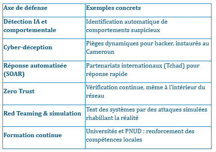 - Consolider la législation et la coopération : cadrage juridique (Malabo, lois nationales) et participation aux initiatives globales (contre les rançongiciels).
